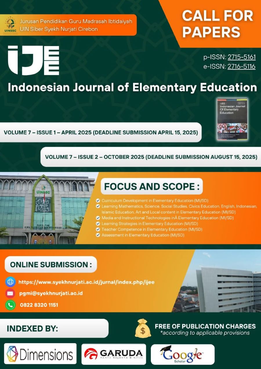 Indonesian Journal of Elementary Education (IJEE) is calling for submissions from researchers, educators, and practitioners dedicated to the growth and development of elementary education. This journal, published twice a year (April and October), aims to provide a platform for innovative research and practical approaches in various areas of elementary education (Focus and Scope). For more information, visit our Author GuidelinesTemplate or contact us via WhatsApp for inquiries. Submit your article